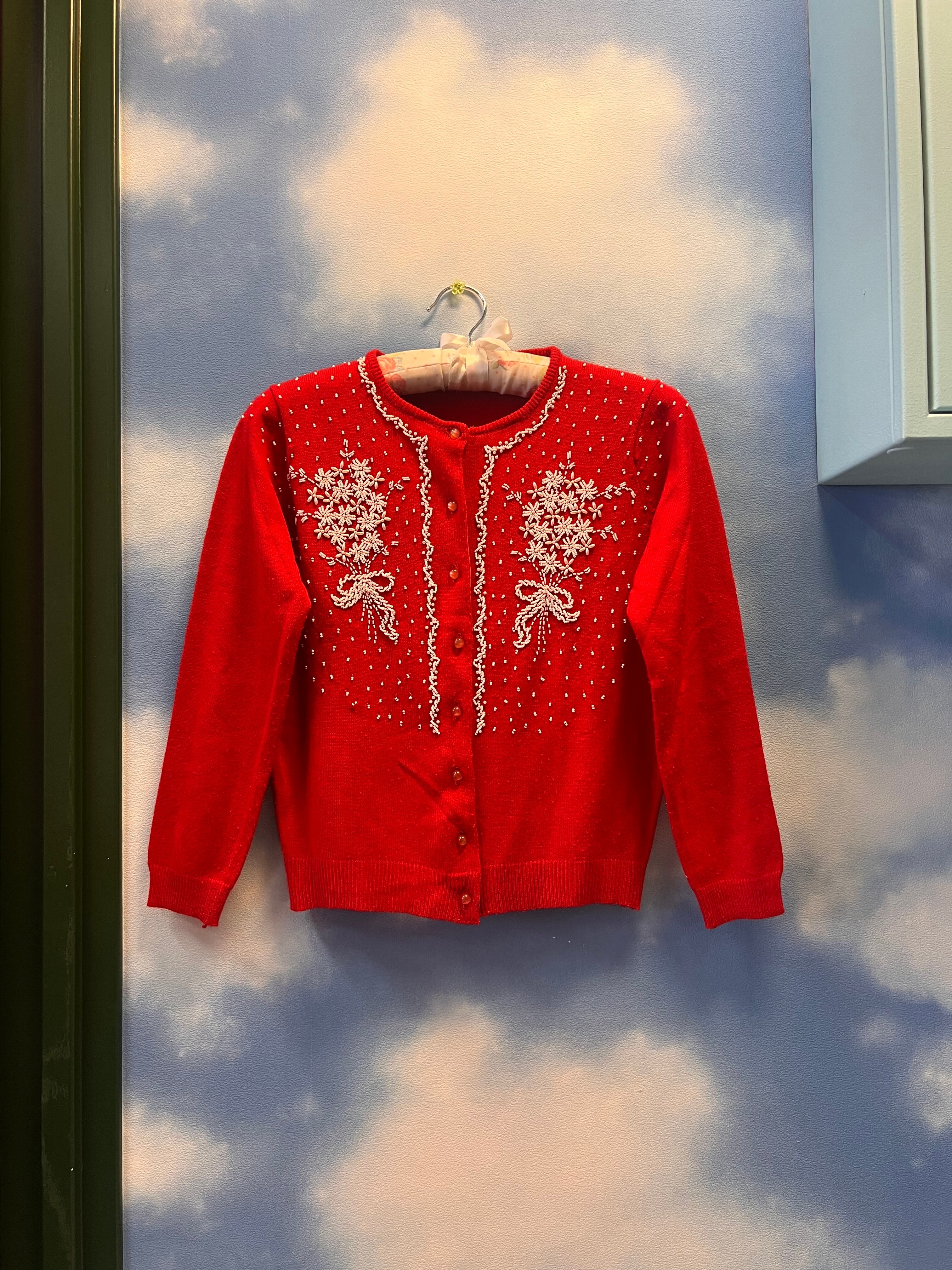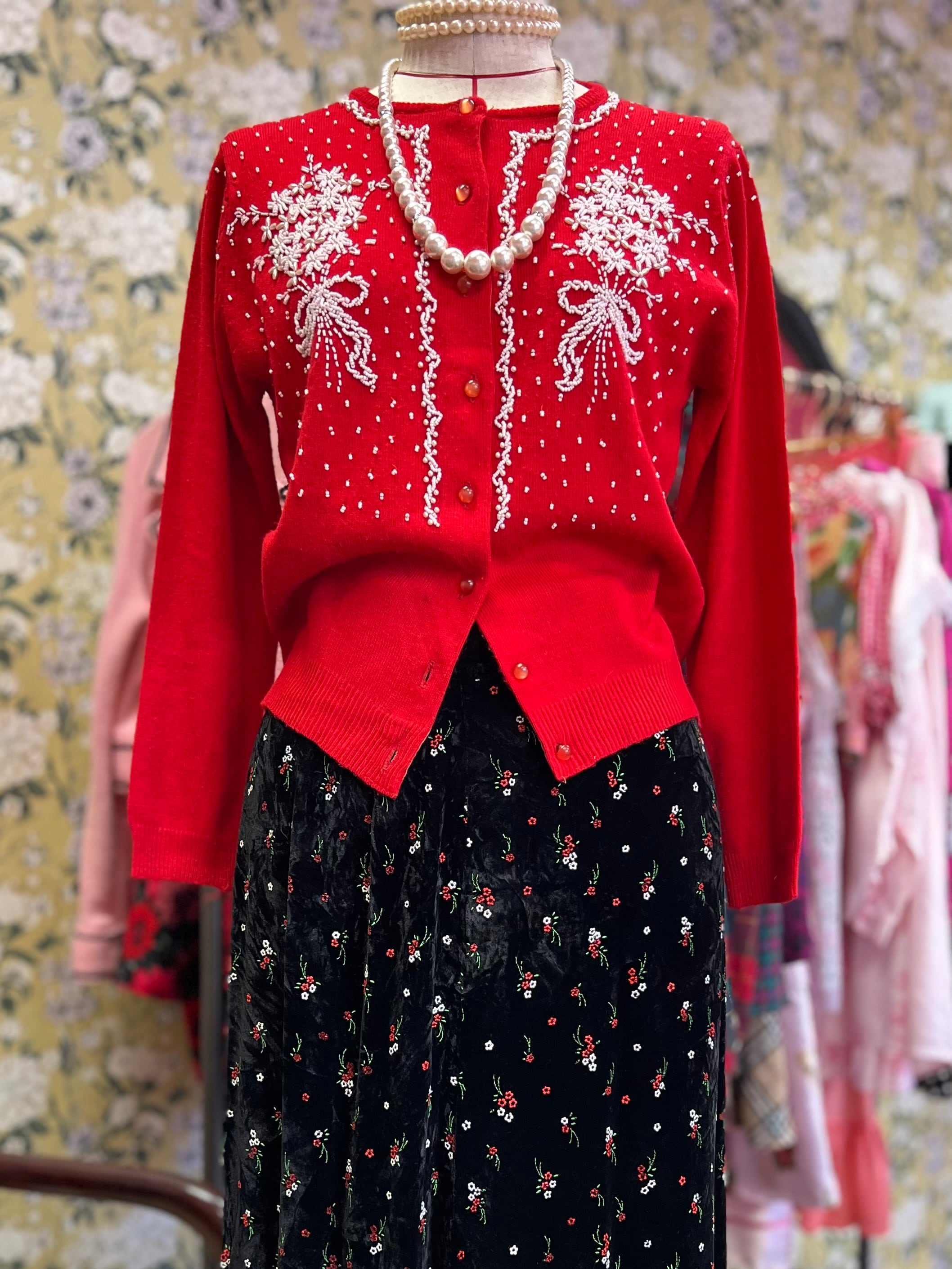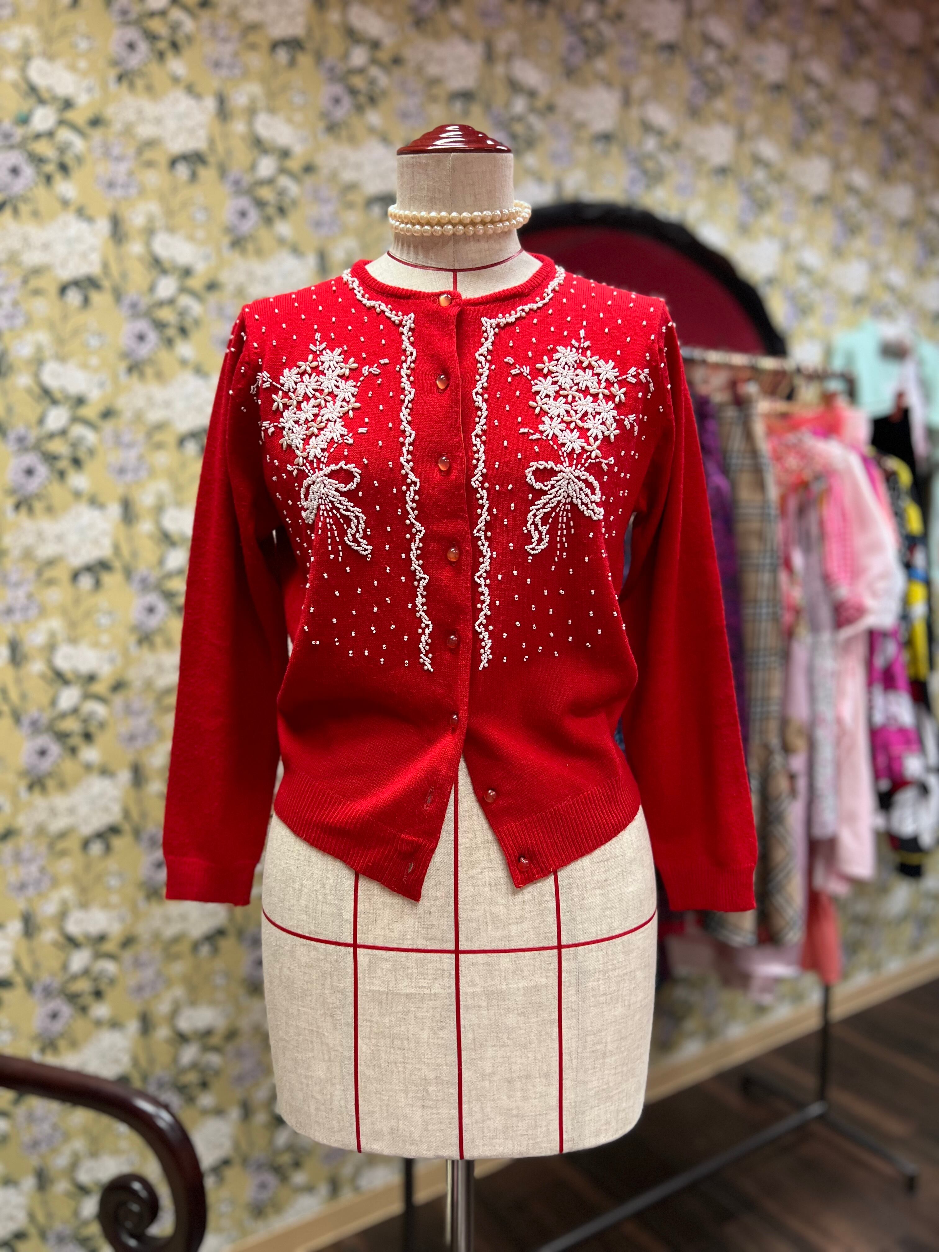 ホワイトビーズブーケのレトロカーディガン